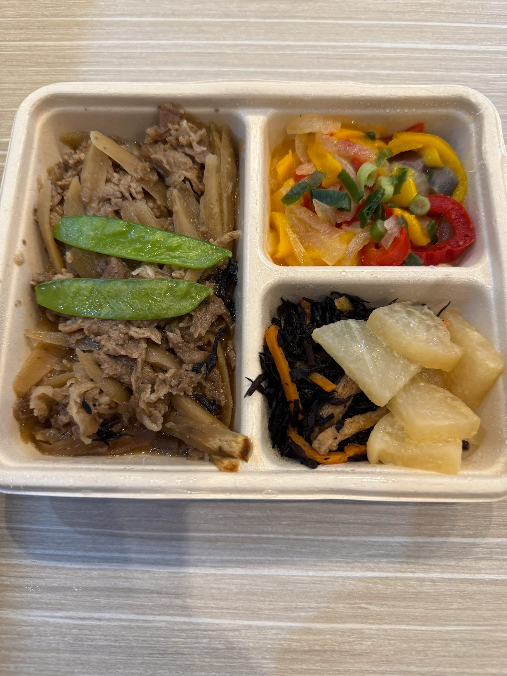 各お弁当は1食分ずつトレーとフィルムで密封されており、食材が偏らないよう工夫されています。かなり薄い設計なので、冷凍庫を圧迫せず綺麗に収まります。