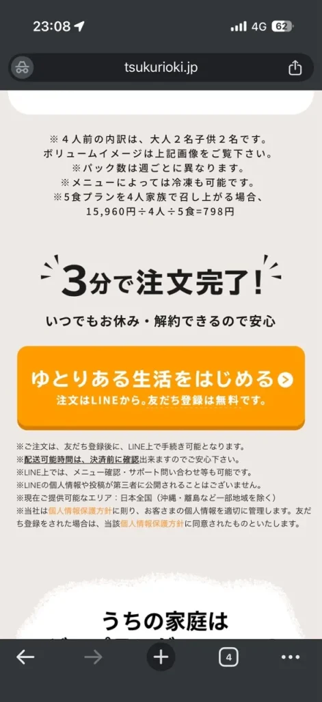 つくりおき.jpは、1回だけの利用も可能。早速試してみたいという方は、公式サイトからLINE友だち登録し注文して下さい。(友だち登録は無料でお休み・解約もLINEから簡単にできます)